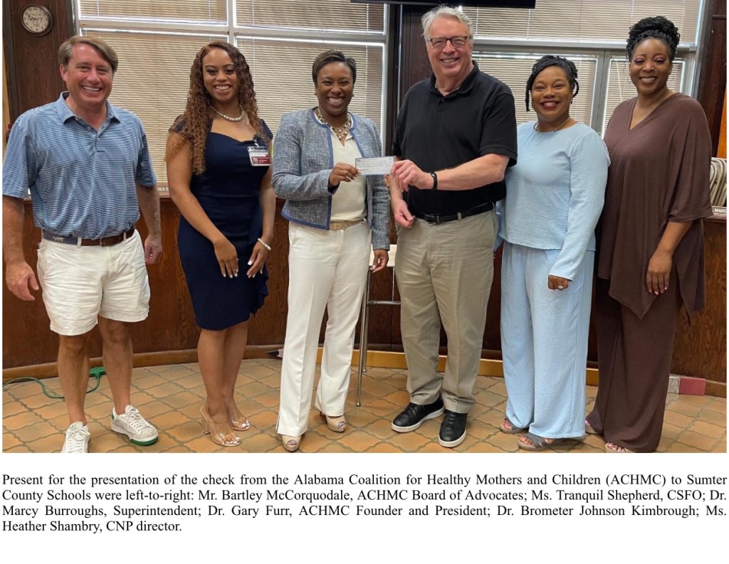 SUMTER COUNTY, AL — The Alabama Coalition for Healthy Mothers and Children (ACHMC), in partnership with Sumter County Schools, is pleased to announce the launch of a new initiative to provide beds and bedding to students in need. This project, titled “Don’t Forget the Little Ones,” was made possible by a significant and timely donation from a generous ACHMC donor of $15,000 which was a significant initial step in funding the $25,000 project. A check was presented August 8 to Marcy Burroughs, superintendent of Sumter County Schools by Gary Furr, Founder and President of ACHMC and Bart McCorquodale , a member of the ACHMC’s Board of Advocates. An additional $5,000 check was also designated by ACHMC for the “FightingHunger, Feeding Hope” project, providing meals for half of the school year for program participants.