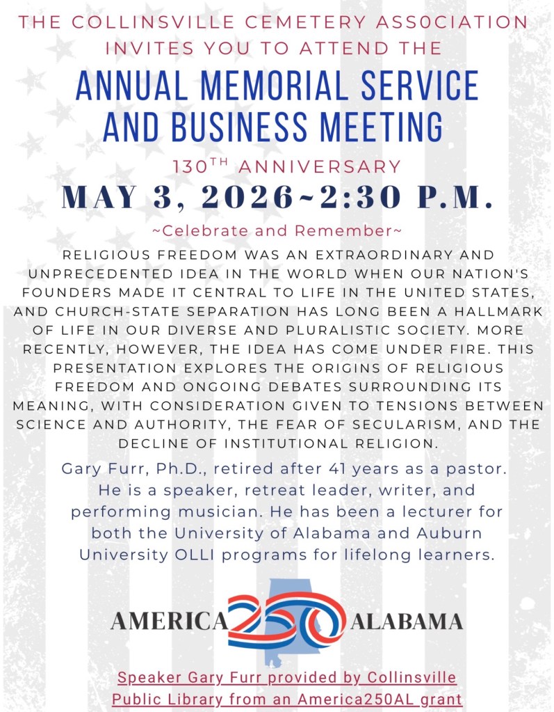 For friends in Ft. Payne, Collinsville, and nearby, I will be speaking in Collinsville, Alabama on Sunday, May 3 at 2:30 pm at the invitation of the Collinsville Historical Association. Collinsville, nestled between Sand Mountain to the west and Lookout Mountain to the northeast, is a small town with a long and interesting history. I will be speaking on “Religion, the First Amendment, and the Shape We’re In,” as part of the Decoration Day Observance at the historic Collinsville Cemetery. All are welcome. It will be outdoors, but the weather is predicted to be favorable.